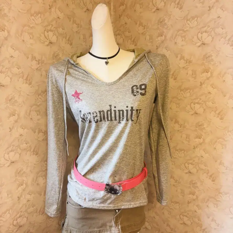 헤이세이 갸루 Y2K 영문 프린트 후드 부착 긴팔 T셔츠 그레이 그런지
