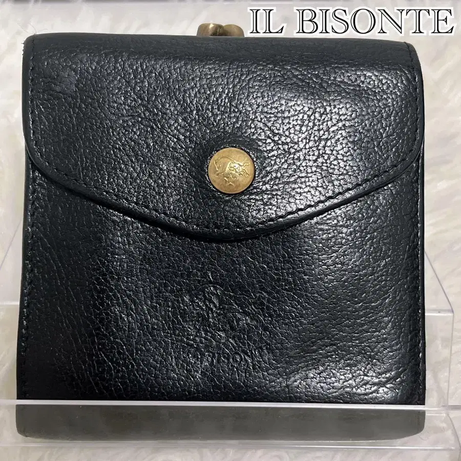 일비종떼 접이식 지갑 블랙 가죽 가마구치 골드 버튼 로고 엠보