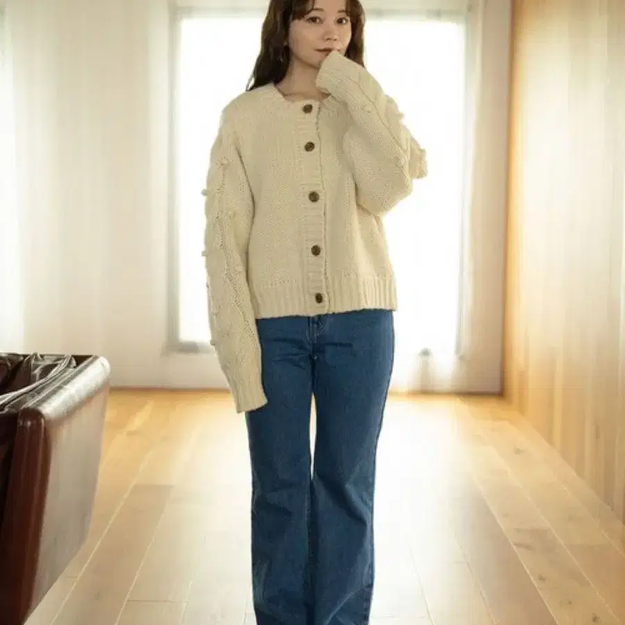 쌀쌀한 시기에 딱 맞는, 울 100%의 굵게 짠 로우게이지 니트 가디건.