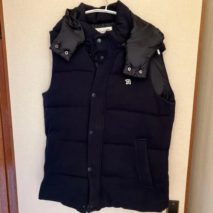 네이비 후드 부착 다운 베스트 우산 자수