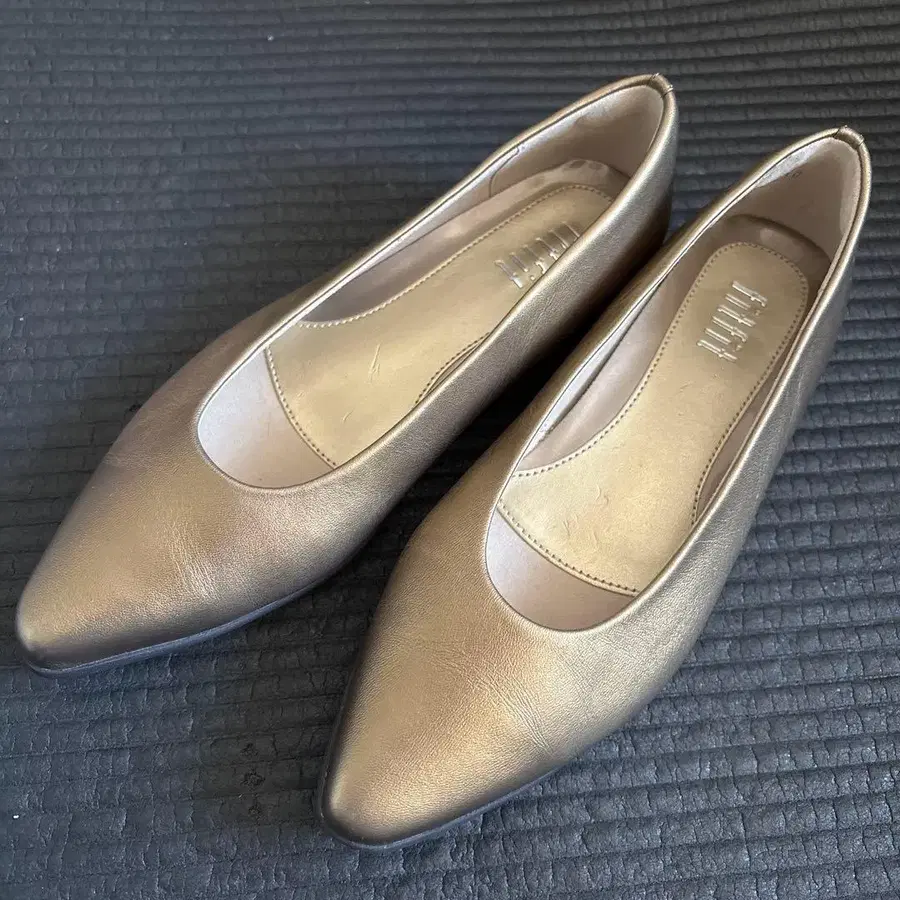 천연 가죽 새상품급 골드 스틸레토 플랫슈즈