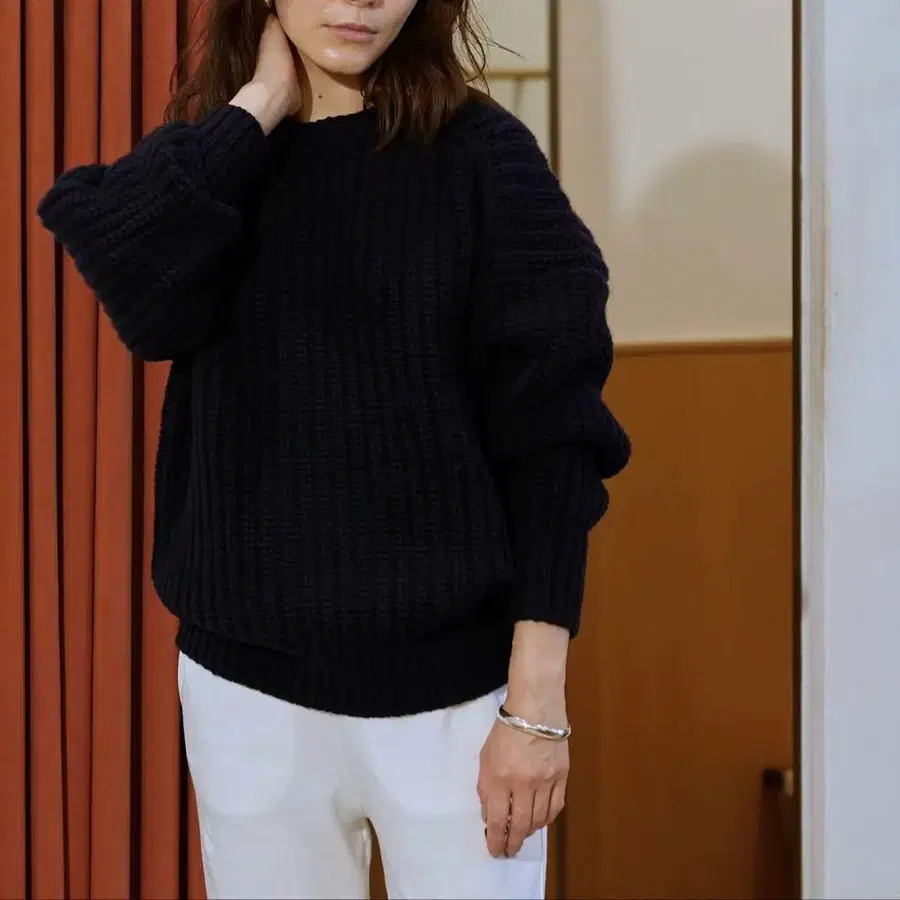 윔 가젯 리브 편직 긴팔 스웨터 네이비