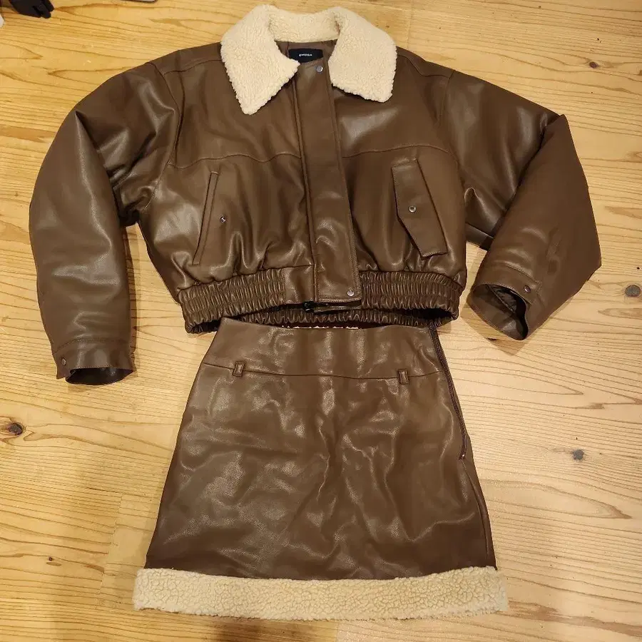 에모다 인조 가죽 보아 블루종 스커트 브라운 셋업
