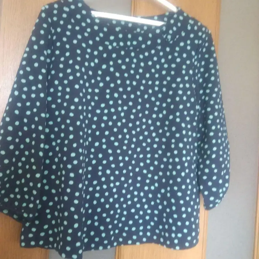 네이비 x 민트 그린 도트 오부 소매 블라우스