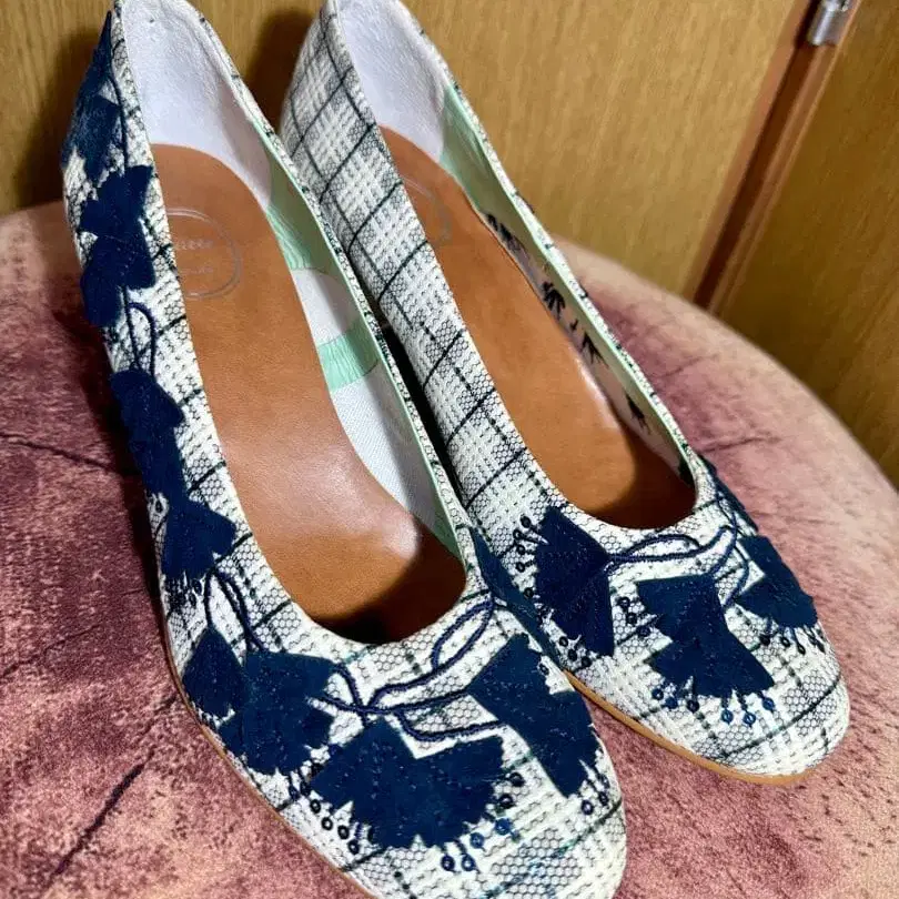 새상품 미사용 펌프스 체크 무늬 꽃무늬 자수 23.5cm