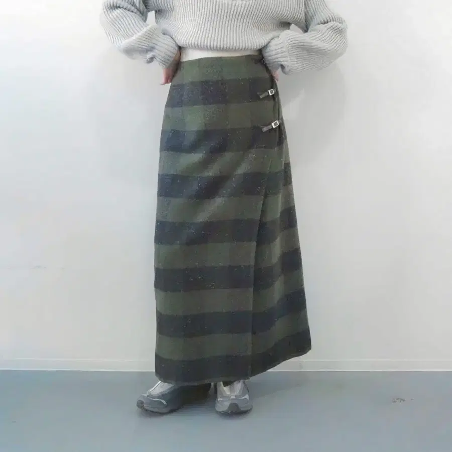 올리브 그린 블랙 보더 울 타이트 스커트 랩 스커트