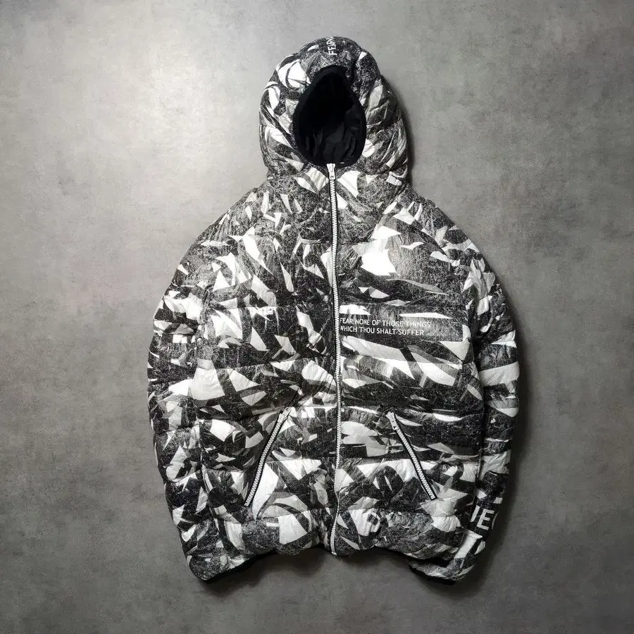 재생지를 리사이클한 타이벡 소재를 사용한 독특한 질감, 메시지성이 강한 그래픽이 특징인 아트적인 분위기가 감도는 다운 자켓.