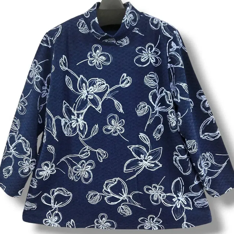 손그림 페인팅 꽃무늬 네이비 튜닉 하이넥 플라워