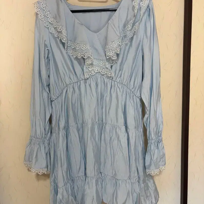 Archive 스카이블루 레이스 부착 긴팔 미니 원피스