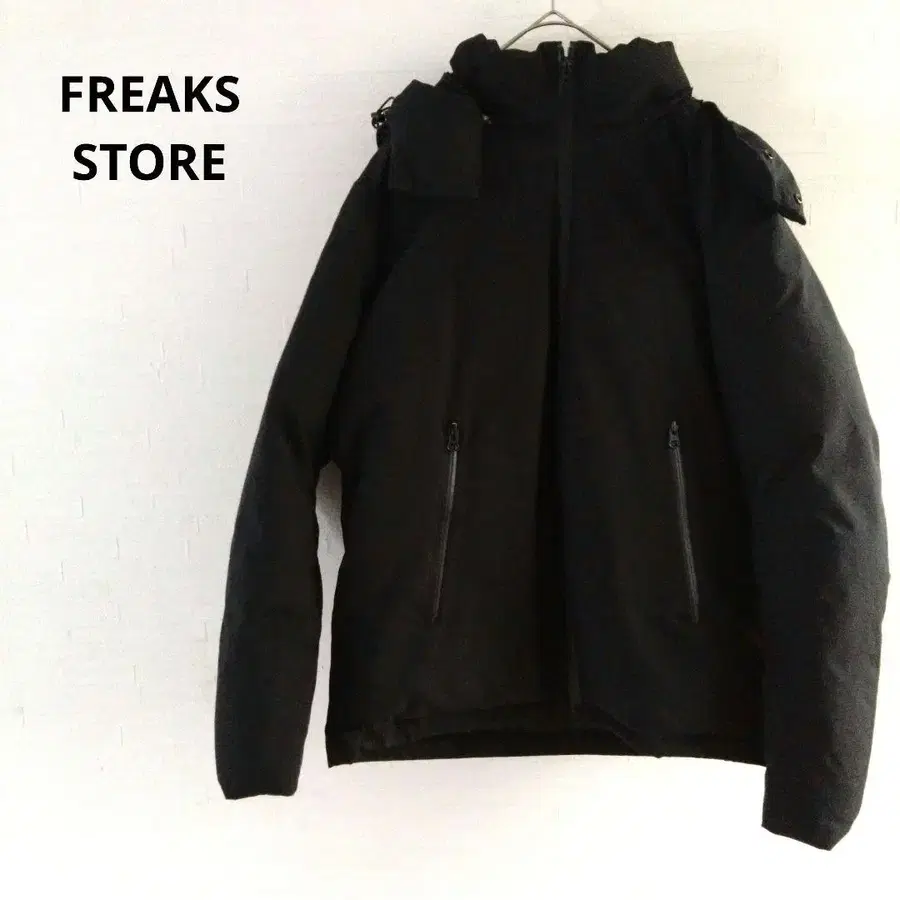 FREAKS STORE의 블랙 다운 자켓, 프론트 지퍼와 사이드 포켓이 있습니다.