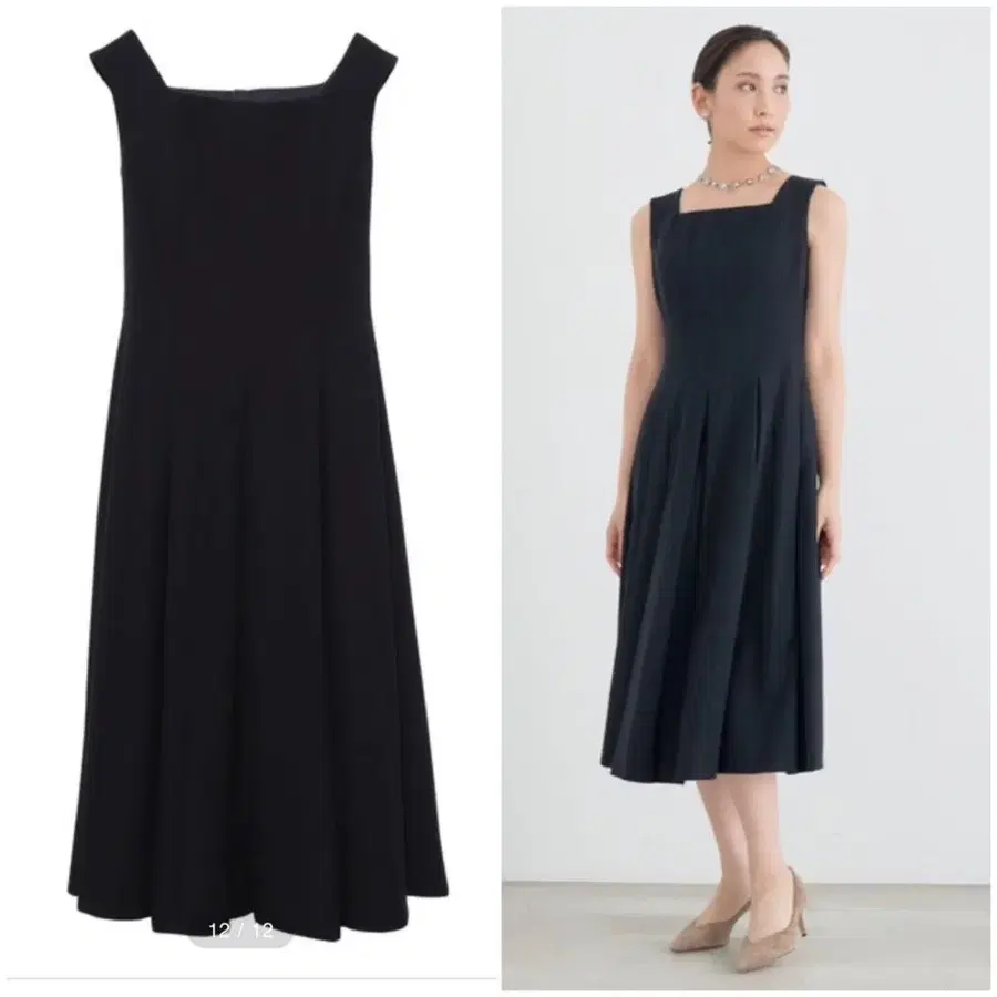 ANAYI 울 그로그랭 턱 플레어 롱 원피스 다크 네이비 네이비