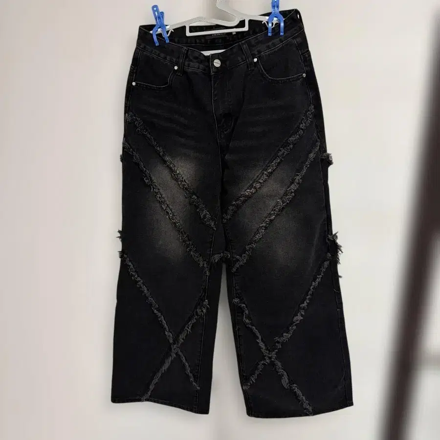 프린지 가공 블랙 와이드 레그 데님 팬츠