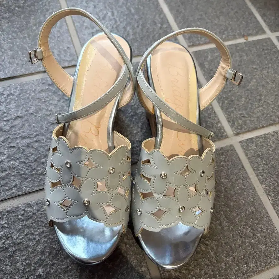 시원한 스카이블루 색상과 반짝이는 디자인이 정말 귀여운 샌들입니다! 플랫폼 부분에도 꽃이 달려 있어 매우 멋스럽습니다 ♪