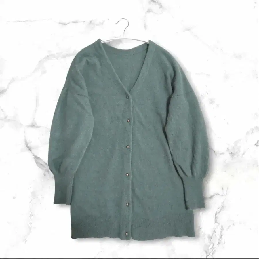 라쿤 50% 그린 V넥 미디엄 기장 가디건, 벌룬 슬리브 디자인. 금장 버튼도 포인트입니다 ♪