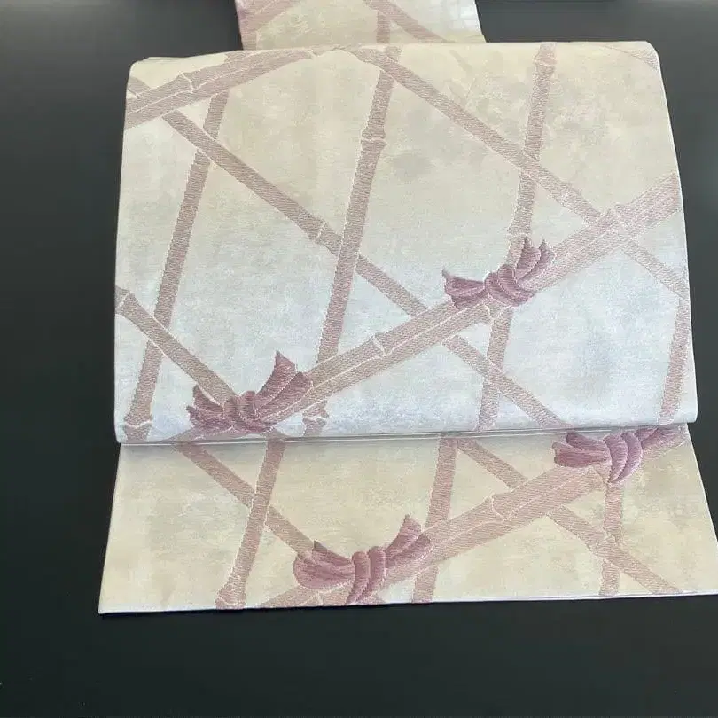 나고야 오비 실버 바탕에 보라색 리본 무늬