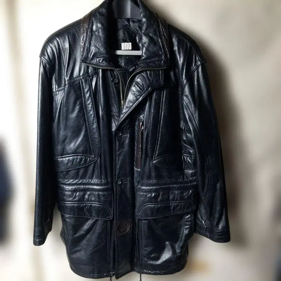 가죽 소가죽 블랙 아우터, 지퍼와 버튼이 있어 기능적입니다. 아주 오래전에 새 상품으로 트레디셔널 샵에서 구매했으며 2회 정도 착용 후 보관 상태였습니다. 브랜드: UNO 루즈한 사이즈 (아래 치수를 확인해 주세요) 복고풍 느낌의 가죽 코트 - 색상: 블랙 - 소재: 가죽 소가죽 - 스타일: 코트 - 디자인: 지퍼 있음, 버튼 있음 - 특징: 프론트 3개, 내부 2개 포켓 허리와 밑단 부분은 끈으로 조일 수 있습니다. 프론트 포켓은 빅 사이즈입니다. 방문해 주셔서 감사합니다. 어깨 너비/가슴 너비/소매 길이/기장 어깨 너비 - 약 58cm 가슴 너비 - 약 62cm 소매 길이 - 약 58cm 기장 - 약 81cm 얼룩, 찢김, 냄새 등 - 없음 (미세한 스크래치는 있을 수 있습니다?) 옷깃, 소매에는 얼룩, 흠집 없음.