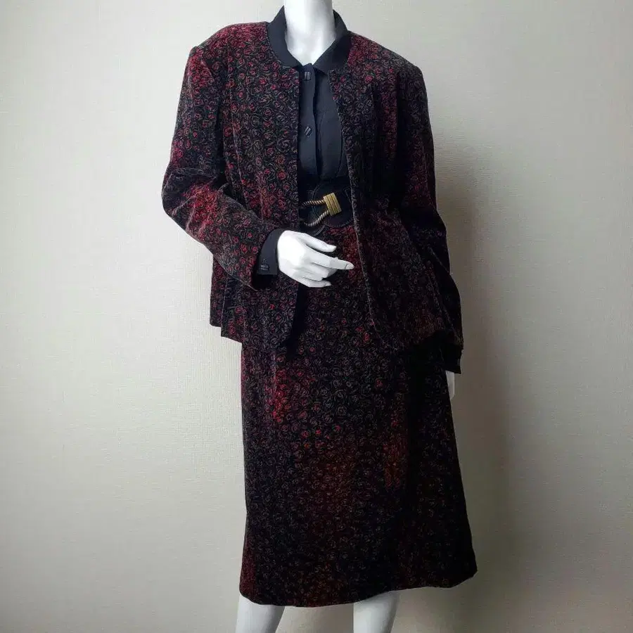 [ 겨울을 물들이는 엘레강트한 한 벌 ] 촉촉하고 윤기 나는 광택이 매력적인 벨로아 소재를 사용한 노카라 자켓과 스커트 셋업입니다. 깊이 있는 블랙 베이스에, 정열적인 빨간색 꽃무늬가 돋보이는 디자인. 벨로아 특유의 빛에 따라 변하는 표정이 고급스러움과 성숙한 매력을 연출합니다.