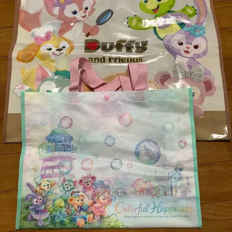 미사용 새상품인 더피 & 프렌즈와 20주년 컬러풀 해피니스의 쇼핑백 2장 세트입니다.