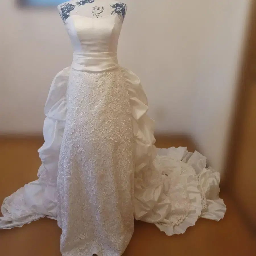 머메이드와 프린세스 드레스의 장점만을 모은 드레스입니다. 7호 레이스업이므로 5~9호까지 착용 가능합니다. 다른 드레스들도 많이 출품하고 있습니다. 드레스 가게에서는 몸에 맞는 세밀한 사이즈 조절이 필요하다고 세일즈 멘트를 합니다. 그것은 높은 가격을 제시하고 싶기 때문입니다. 하지만 사진관 등에서는 왜 저렴하게 촬영할 수 있을까요? 사실은 프리 사이즈로도 충분하기 때문입니다. 또한, 해외 수입 드레스는 원단이 얇아서인지 스커트 아래 가랑이 라인이 비쳐 보일 수 있으니 주의가 필요합니다. 상태는 사진으로 확인해 주세요. 취미로 모았던 것이므로 세세한 부분까지 체크하지는 않았습니다. 완벽한 것을 원하시는 분께는 부적합합니다. 레이스와 리본 장식이 더해진 화이트 머메이드 라인 웨딩 드레스, 긴 트레인 포함. - 색상: 화이트 - 디자인: 레이스와 리본 장식 - 스타일: 머메이드 라인 - 소재: 새틴과 레이스 - 트레인: 긴 트레인 포함 방문해 주셔서 감사합니다.