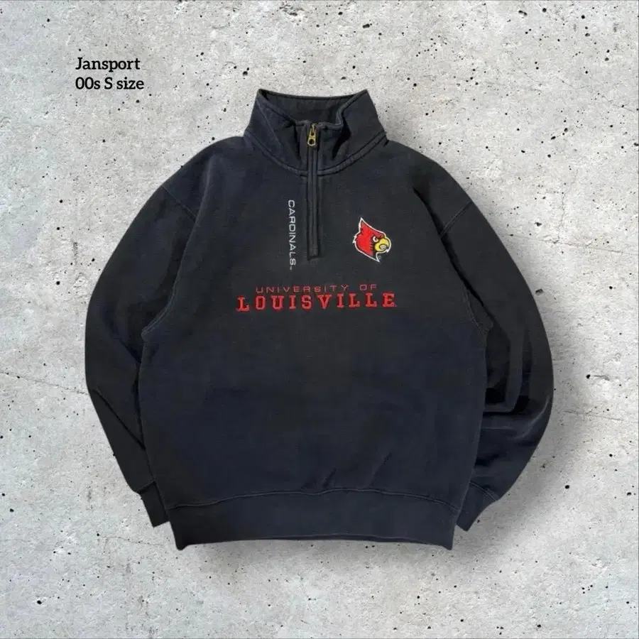 Jansport 제조 하프 지퍼 맨투맨. 루이빌 대학 로고와 마스코트가 자수된 아이코닉한 디자인이 특징. 심플하면서도 존재감 있는 1벌로, 스트릿 스타일이나 캐주얼 코디에도 ◎.