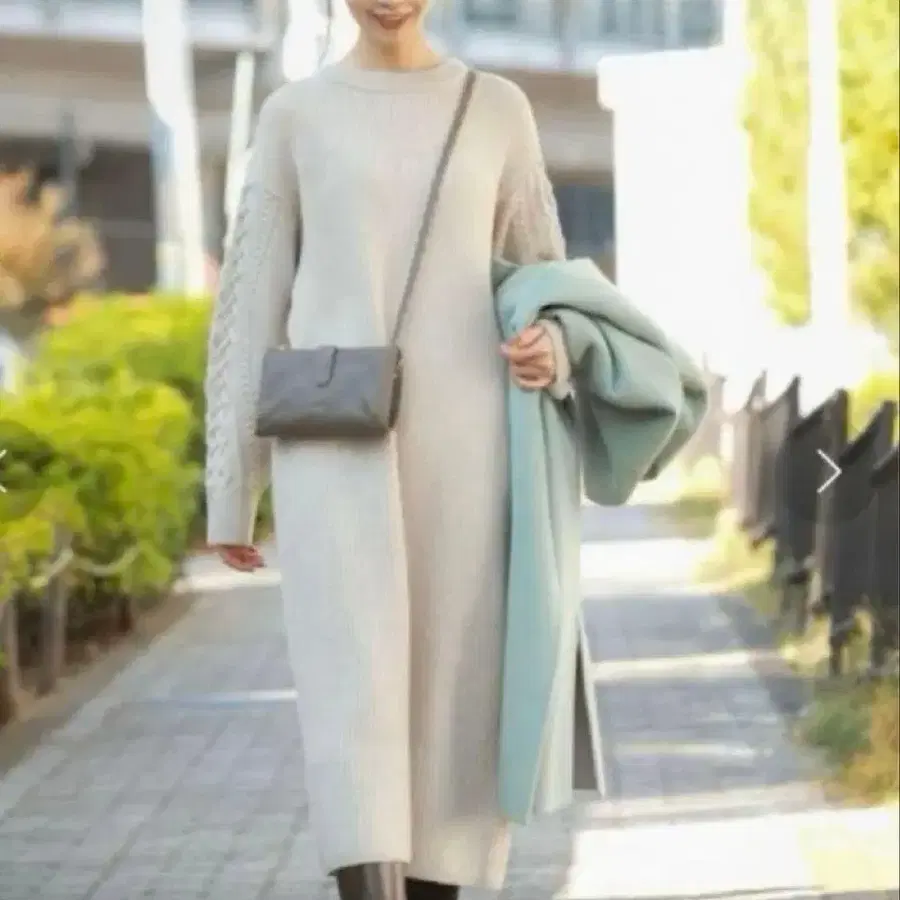 [가을/겨울 스타일에 필수적인 니트 원피스] 소매의 꽈배기 패턴이 존재감을 뽐내는 내추럴 무드 가득한 상품입니다.