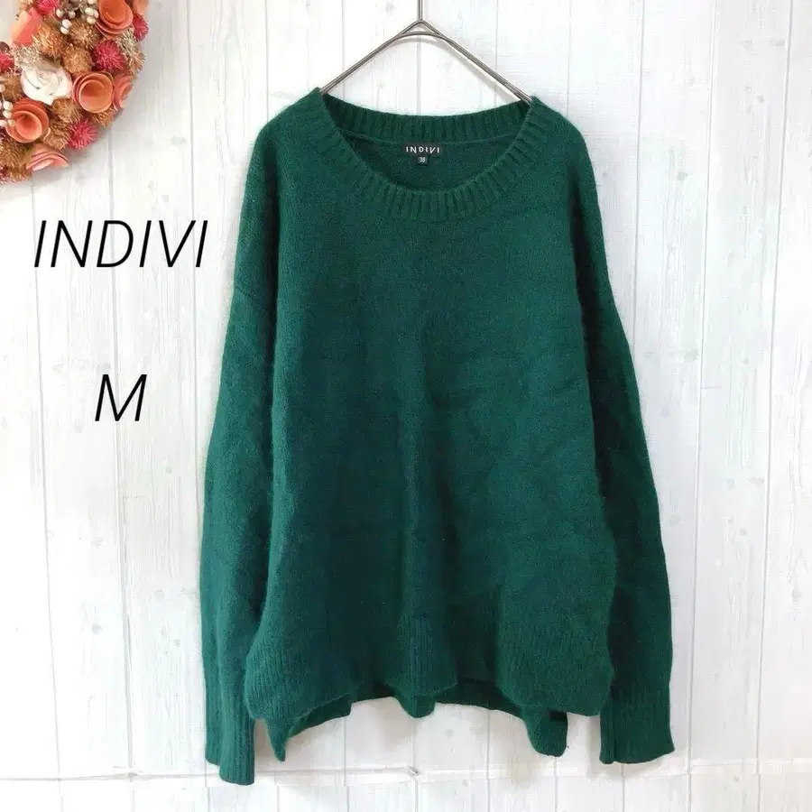 인디비 니트 스웨터 양모 너구리 하이넥 그린 M 루즈핏