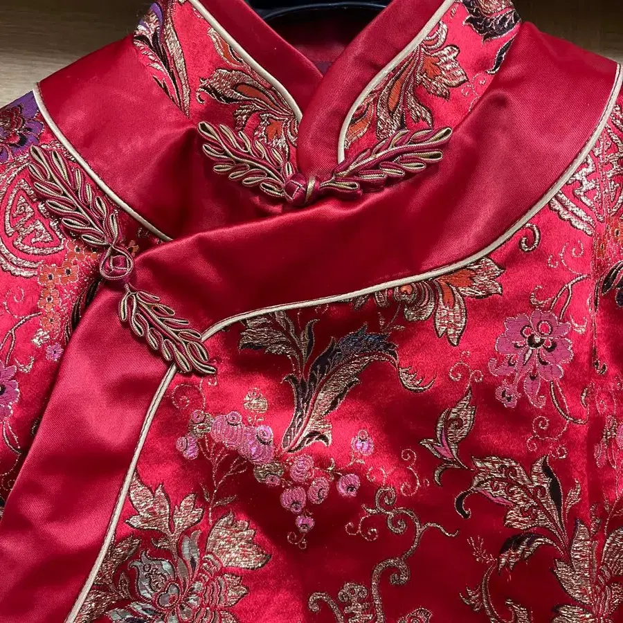 짜여진 전통적인 꽃 문양과 입체적인 차이나 버튼(연꽃 매듭)이 고급스러움을 자아냅니다. 안감도 튼튼하며, 광택감 있는 고급스러운 마감입니다.