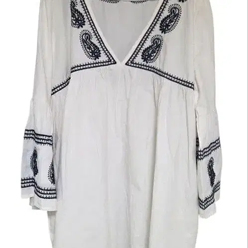 자수 코튼 튜닉 블라우스 화이트 V넥 긴팔