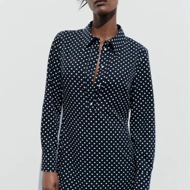 네이비 화이트 도트 긴팔 미니 드레스