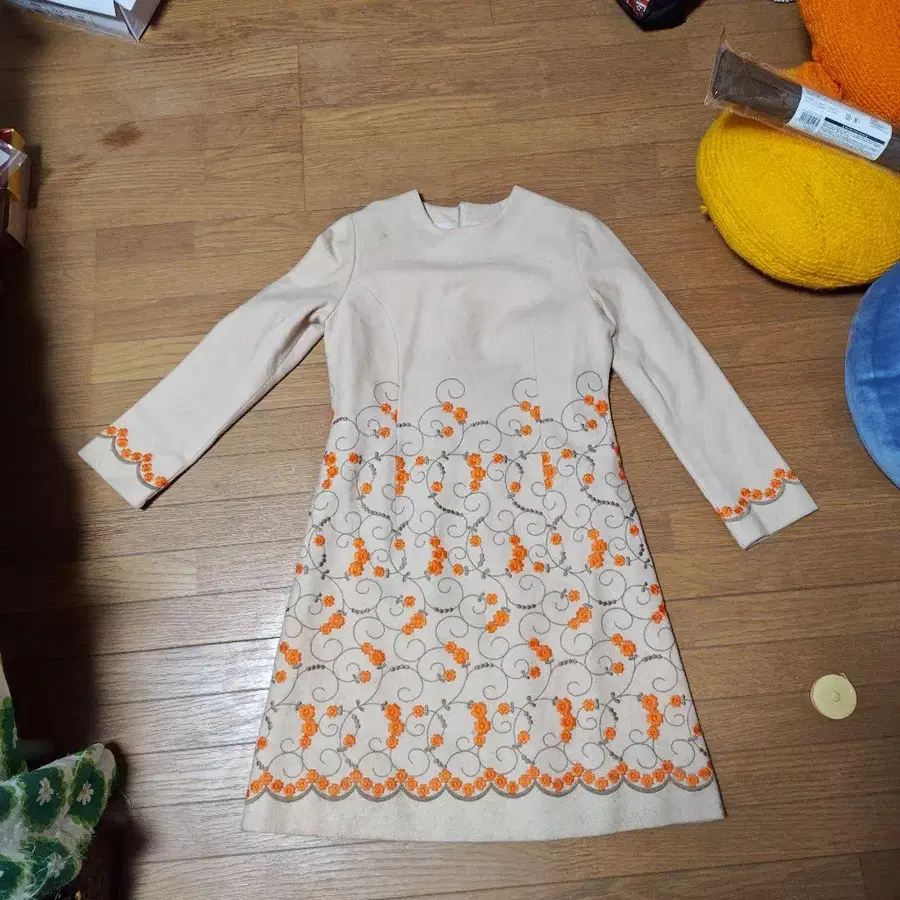 쇼와 레트로 베이지 꽃무늬 자수 긴팔 원피스