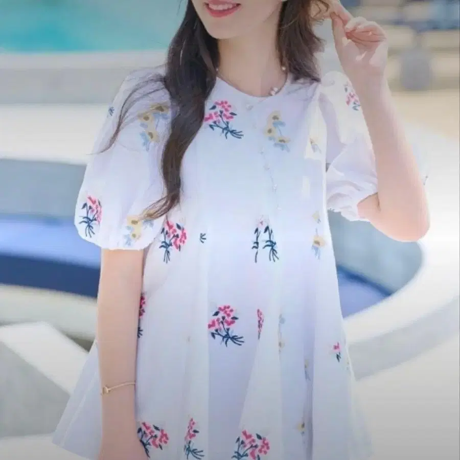 [ chesty ] 플라워 자수 플레어 상의 블라우스 퍼프 슬리브 반팔