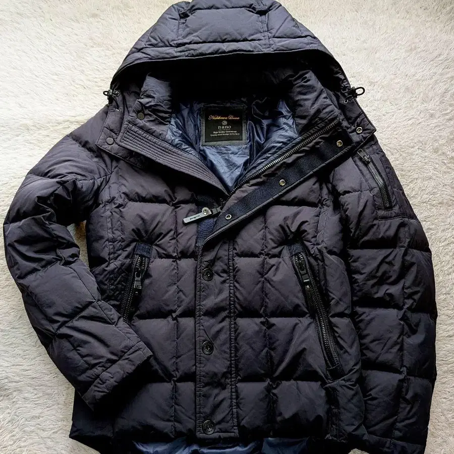 자동 번역되었어요. 원문보기탈부착 가능한 후드와 지퍼 포켓이 있는 네이비 퀼팅 다운 자켓.