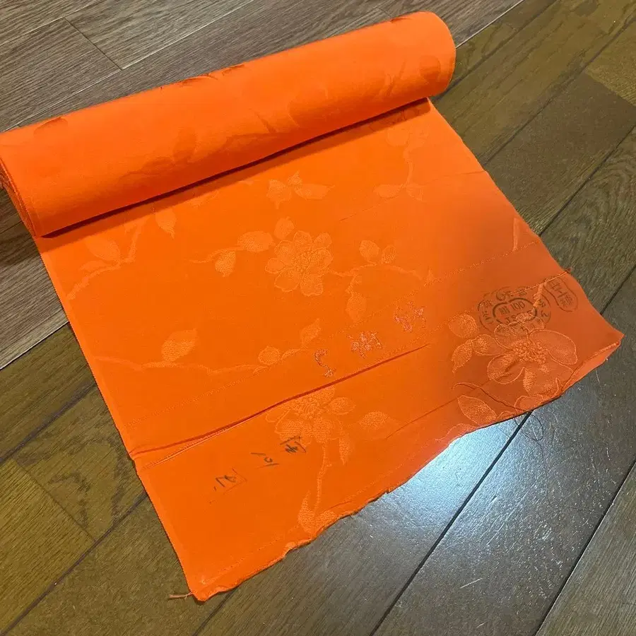 쇼와 레트로 오렌지 컬러 꽃무늬 자수 실크 100% 옷감 원단
