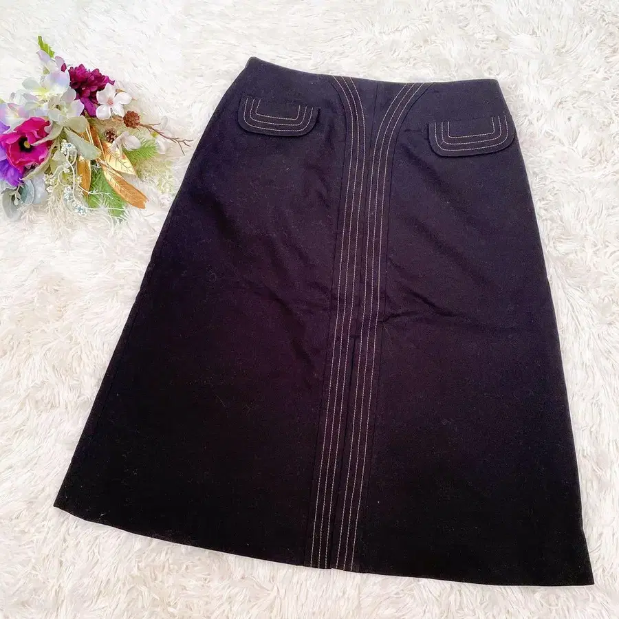 대비 스티치가 특징인 블랙 타이트 스커트.