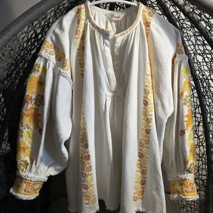 방문해 주셔서 감사합니다. 프릭스스토어 취급 프리다 블라우스입니다. 두꺼운 코튼 소재에 섬세한 자수가 놓여 있습니다. 사이즈는 프리 사이즈입니다. 가격은 18700엔입니다. 자수의 세부 사항까지 검품하기는 어렵지만, 올풀림 등 문제없이 착용 가능하다고 생각합니다. 사이트 내에서 가격과 상태를 확인하고 저렴하게 판매하므로, 중고 의류에 이해가 있는 분만 부탁드립니다. 소량 남았지만 다른 상품도 판매 중입니다. ( • ᵕᴗᵕ • )⁾⁾ᵖᵉᵏᵒ [ Frida ] 멕시코 여성 화가 Frida Kahlo(프리다 카로)를 브랜드 아이콘으로, 멕시코 특유의 비비드한 색감과 패턴, 구제 의류를 오리지널로 한 밀리터리 요소를 믹스한 브랜드. 트렌드에 좌우되지 않고 형태는 어디까지나 베이직하며, 소재에こだわ신 상품이 많습니다. 여름옷, 겨울 의류처럼 기온으로 구분하지 않고 코디에 따라 오랜 기간 착용할 수 있는 아이템이 많은 것이 특징입니다. 전통적인 자수 기술과 인도 면의 중후한 느낌이 융합된, 성인 취향의 자수 블라우스. 헤비 코튼 슬라브라는 인도의 와이드한 슬라브사(표면이 고르지 않은 면사)를 사용했습니다.