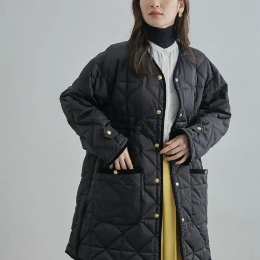 [ 소재 ] 이탈리아 LIMONTA(리몬타)사의 경량으로 윤기 있는 고급 새틴 소재를 사용했습니다. 스트레치성, 투습 방풍성, 꽃가루 가드 등 기능성도 뛰어난 소재입니다. 다이아와 스퀘어를 믹스한 오리지널 퀼트로 디자인 스티치를 표현했습니다. 필파워 800으로 한겨울에도 충분한 따뜻함입니다. [ 디자인 실루엣 ] 고급스럽고 기능적인 새틴 타프타에 TAION과 콜라보레이션으로 오리지널 퀼팅을 더했습니다. 다운을 넣어 다이아 퀼트와 스퀘어 퀼트를 겹쳐 TAION x LIMONTA와의 W 네임 콜라보를 실현했습니다. 박스형으로 등 부분에 플레어를 더한 실루엣에 신경 쓴 오버사이즈 퀼트 코트는 V넥 디자인입니다. 카라 주변, 밑단, 소매에 벨로아로 파이핑을 하여 윤기를 더한 코트는 허리에 드로우 스트링으로 X 라인으로도 입을 수 있는 2Way 디자인입니다. 도트 버튼에는 별주로 만든 골드 도트를 악센트로 사용했습니다. 무릎 아래 기장으로 가벼움과 신선함이 있는 아이템입니다. 다운이라 얇게 느껴지지만 따뜻하고 윤기 있는 아이템입니다.