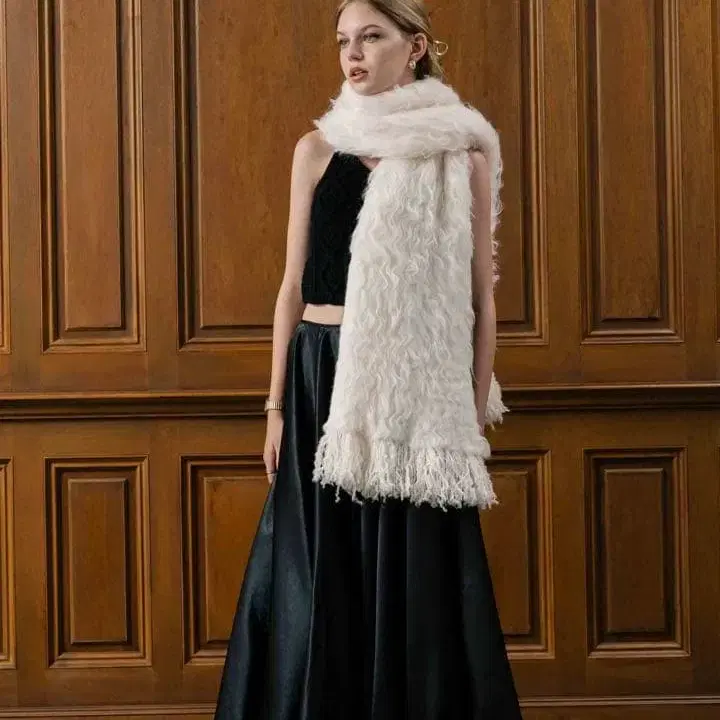 양 끝에는 프린지를 달아 볼륨감 있는 마감으로 추운 겨울에도 바람을 통하지 않습니다. shaggy Vneck knit, shaggy cardigan과 같은 소재, 같은 컬러 전개로 준비되어 있으니 함께 착용하시는 것도 추천합니다.