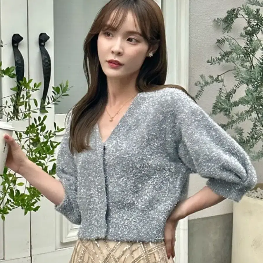 [새상품급] V넥 라메 니트 가디건 실버 셀포드
