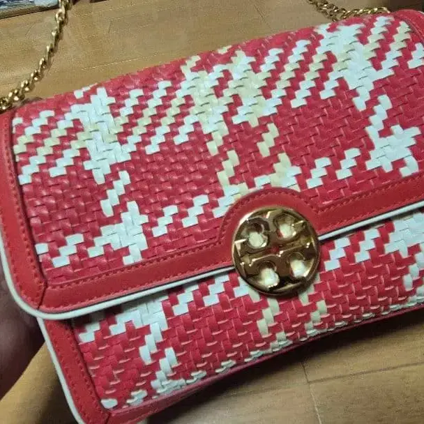 트리보치 빨간색과 화이트 체크 무늬 숄더백