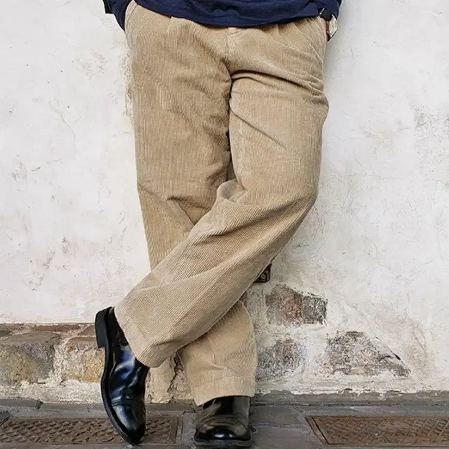 소재는 굵은 폭의 코듀로이 소재를 사용했습니다. 고급스러운 분위기를 풍기는 광택감이 있으며, 원단도 두껍고 부드럽습니다.