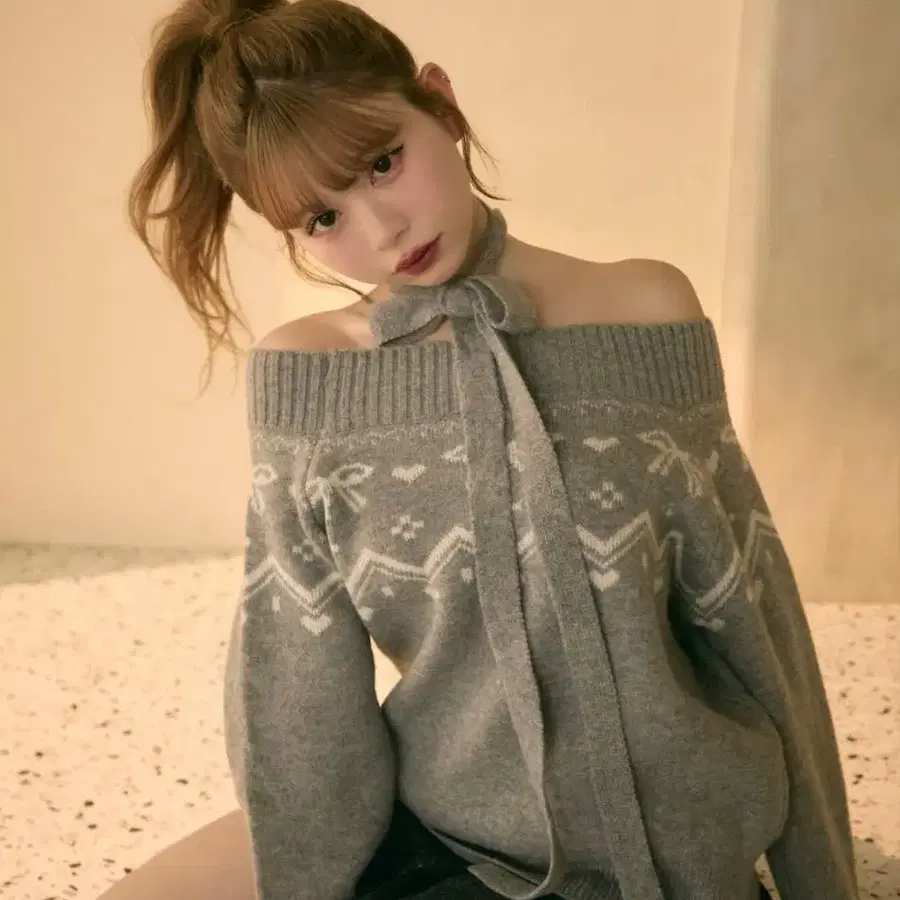 TITTY&CO. 노르딕 무늬 리본 포함 오프숄더 니트 그레이