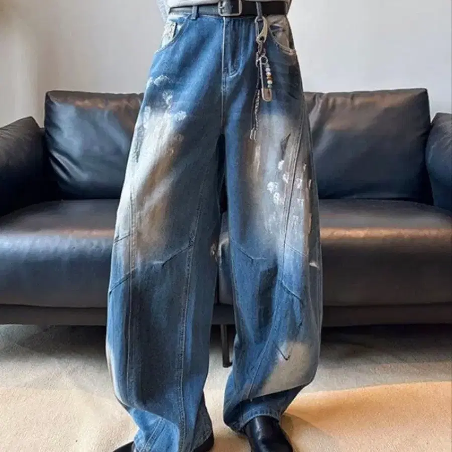 데미지 가공 와이드 데님 팬츠 Y2K 페인트 가공