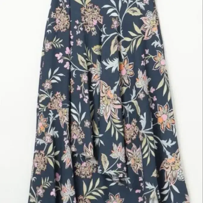 네이비 꽃무늬에 비대칭 프릴이 특징인 플레어 스커트