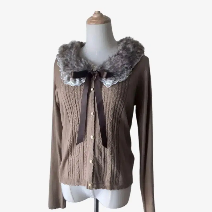 엑시즈팜 퍼 가디건 리본 레이스 펄 버튼