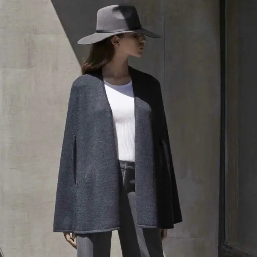암 슬릿이 들어간 엘레강트한 망토 코트.