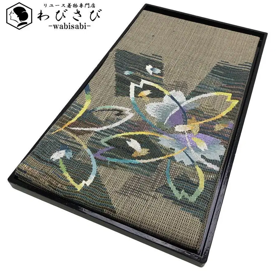 후쿠로 오비 선명한 벚꽃 꽃 무늬 견직물 아마색 O-4824