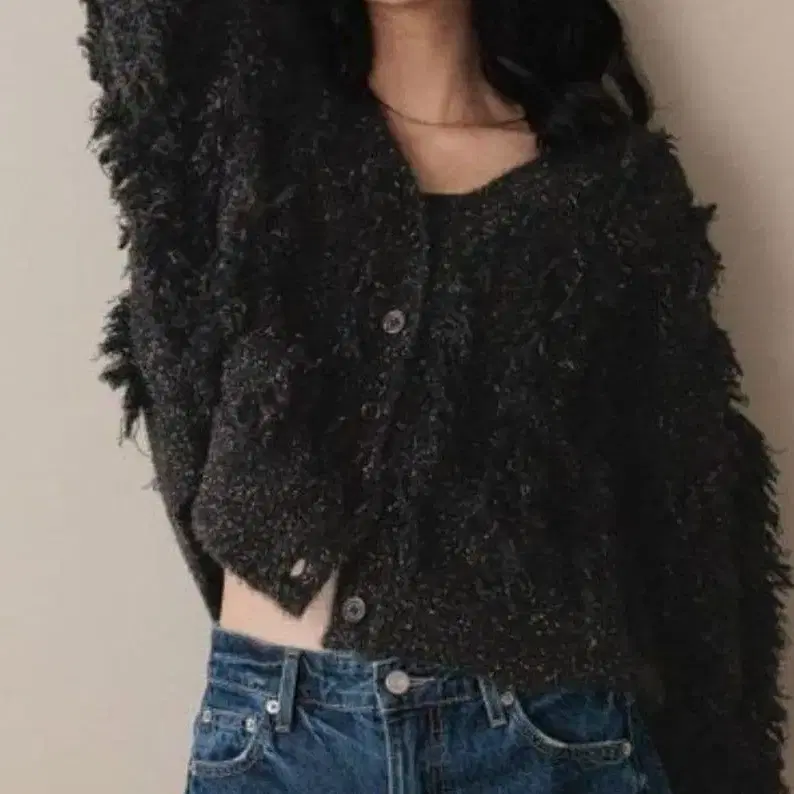 LOWRYS FARM 라메 프린지 2WAY 가디건 블랙 라메