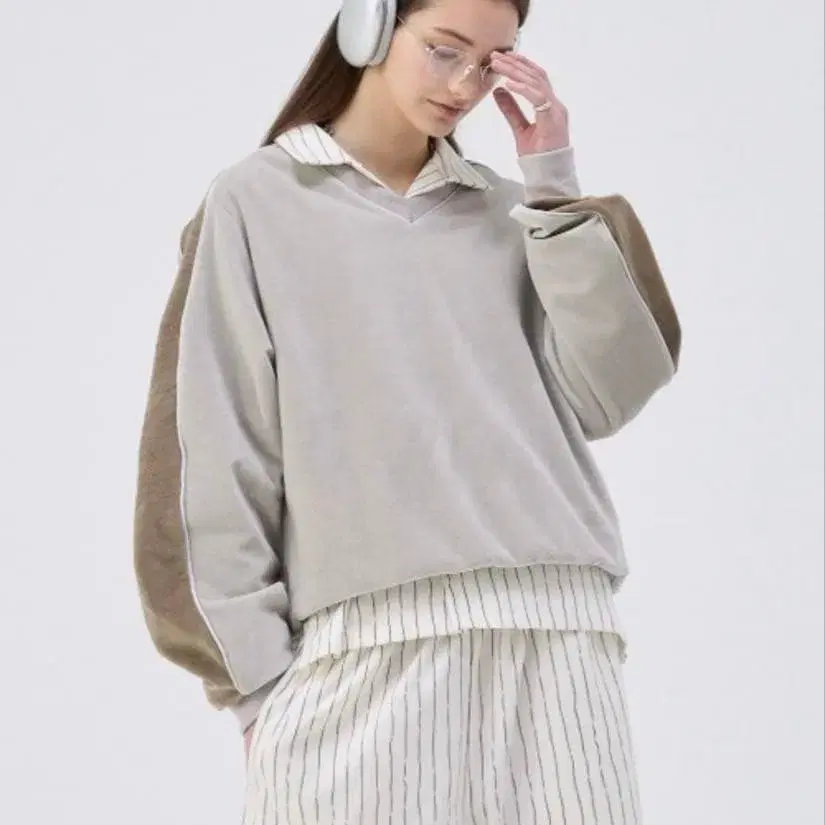 셔츠나 맨투맨 등이 후보에 오르는 상의 중에서도 벨벳 소재와 V넥으로 마무리했기 때문에, 코디네이트에 좋은 악센트를 만들어주는 맨투맨입니다.