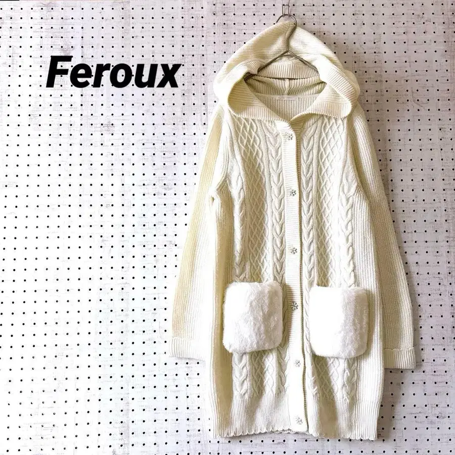 ID a1133 방문해 주셔서 감사합니다 ✨ 다른 상품들도 많이 판매 중입니다 ▼ ▼ ▼ #はちわれ堂 ■ 브랜드명 Feroux ■ 색상 아이보리 ■ 사이즈 표기 사이즈: 2 평평하게 놓았을 때 치수 ( cm ) 소매 길이 59.5, 어깨 너비 39, 가슴 너비 48, 기장 76 ■ 상태 전체적으로 보풀이나 보풀이 약간 보이지만, 컨디션은 좋고 깨끗한 상태입니다. ⸻ [ 상품 설명 ] 복슬복슬한 포켓이 겨울 외출을 귀엽게 연출합니다. 아란 편직의 입체감이 돋보이는 따뜻한 후드 부착 롱 니트입니다. 촉감이 좋은 아크릴 소재에, 볼륨감 있는 인조 모피 포켓이 악센트입니다. 여유롭게 걸칠 수 있는 실루엣으로, 원피스로도 가디건으로도 활용 가능합니다. 방한성도 뛰어나, 한겨울 데이트나 출퇴근 코디에 추천합니다. ☆ 개인 측정으로 인해 약간의 오차는 양해 부탁드립니다. ☆ 소재, 색감은 사진을 참고해 주시기 바랍니다. 모니터에 따라 색상에 차이가 있을 수 있습니다. ☆ 궁금한 점은 언제든지 질문해주세요! ☆ 보관 및 배송 시 생기는 주름은 양해 부탁드립니다. 중고 의류이며 개인 보관품임을 미리 이해해 주시기 바랍니다. ☆ 신중하게 확인하고 있지만, 작은 흠집, 약간의 올풀림, 약간의 얼룩 등은 양해 부탁드립니다. ☆ 기분 좋게 거래하실 수 있도록 노력하겠습니다. ♪ 좋은 옷과 연이 있기를 바랍니다(⑅ • ᴗ • ⑅) ♪ 사이즈 - M $$1580