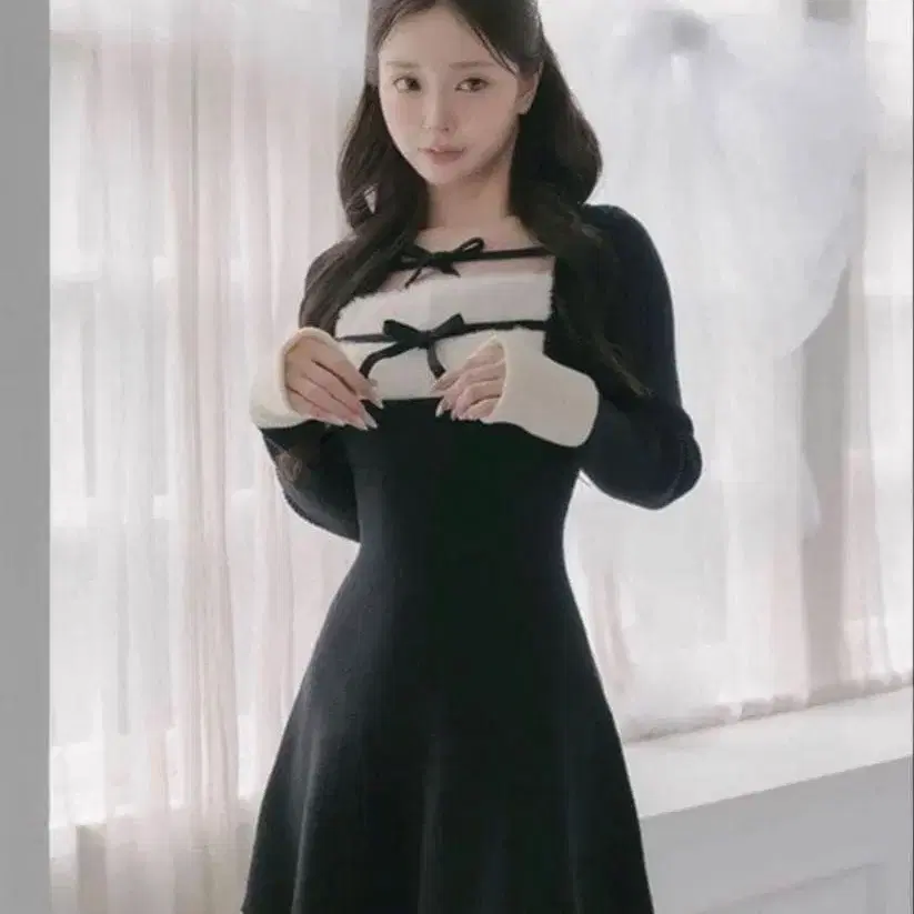 Darich 리본 퍼 플레어 니트 미니 원피스